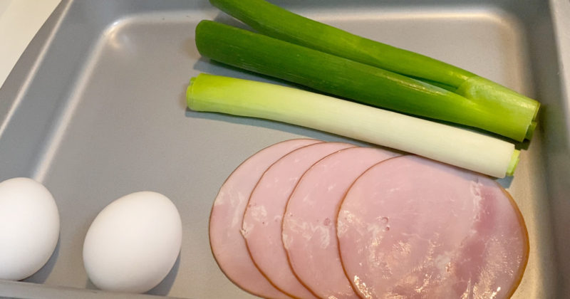 1.ネギは荒みじん、ハムは食べやすい大きさに切ります。